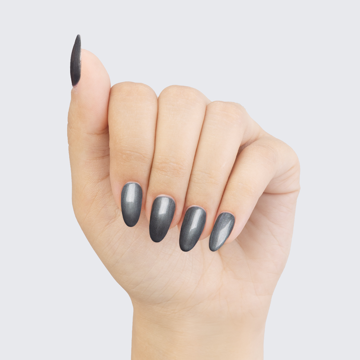 Gunmetal grey. Dark. Pearl finish. Opaque. Cool undertone.